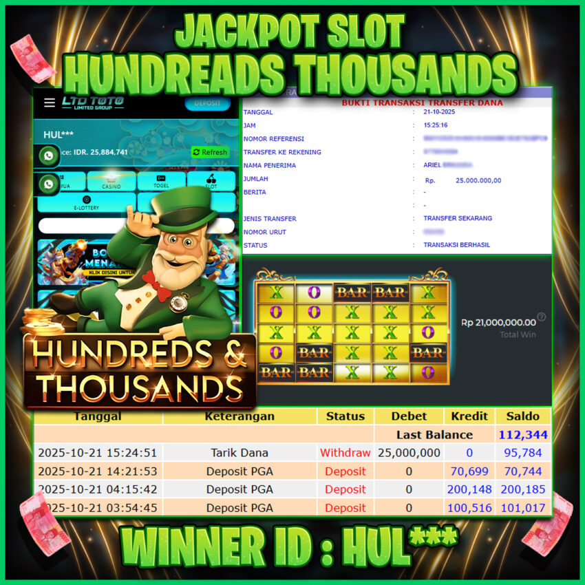 Selamat kepada User id : HUL*** Telah berhasil mendapatkan kemenangan besar pada permainan SLOT HUNDREADS THOUSANDS, kemenangan Sebesar Rp.25.000.000, Setelah mengisi formulir withdraw dengan kurang waktu hanya 5 – 10 menit pihak LTDTOTO sudah melakukan transfer kepada pemilik User id dan dana sudah dapat di cairkan oleh pemenang. Bukti pembayaran yang kami berikan merupakan bukti pembayaran yang SAH / VALID yang langung di dapatkan melaui tanda transfer transaksi dari Bank yang di tuju. Kami mengucapakan banyak Terima Kasih Kepada pemenang karena sudah mempercayakan kami sebagai Bandar Tepercaya yang membayar semua kemenangan member hingga lunas. Masih ragu dengan LTDTOTO bos ? Di mana bandar togel online sekarang yang terpercaya seperti LTDTOTO? Bandar yang mengirimkan kemenangan member tanpa bertele – tele. Jadi…. tidak perlu khwatir pada situs LTDTOTO karena kemenangan anda berapapun akan dibayarakan hingga lunas kepada pemenang.