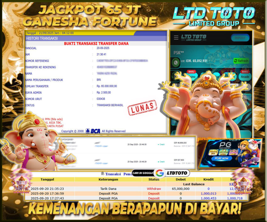 LTDTOTO JACKPOT SLOT GANESHA FORTUNE RP 65.000.000 MINGGU 21 SEPTEMBER 2025