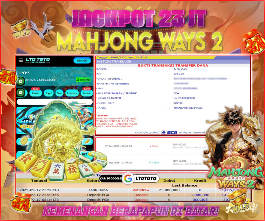 LTDTOTO JACKPOT SLOT MAHJONG WAYS 2 RP 23.000.000 KAMIS 18 SEPTEMBER 2025